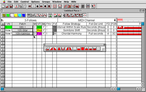 Every presentation or performance of a single piece composed in the authoring software KoanPro is different from any other. Melody, harmony and rhythm are kept variable within a certain, characteristic range by specifying a large number of parameters within the software. To achieve that, new concepts for describing elements of a composition have been developed. For example, the voice type 'Follows' (see illustration) offers several possibilities to imitate other voices. 'Fixed Pattern' (see illustration) allows the accurate notation of melodic lines, however, it can be specified to which percentage of accuracy a line will be realised. Other voice types can also be influenced by the user's interaction via the mouse etc.