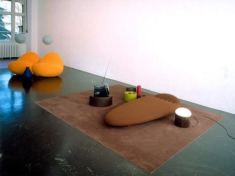 In the throes of Techno- and Lounge Culture of the 1990s, many artistic designs were created for furnishings and exhibitions addressing the reception of electronic works. While Dan Graham could be said to have developed the public character of this situation, Rehberger designed, as clarified by the title, ironic and yet functional pieces of furniture which today are found largely in private collections. While Graham most notably tried to place the video tape and communicative situation in the context of an exhibition, Rehberger is largely concerned with Pop aesthetics, TV-Design, and reflections on our omnipresent television culture.