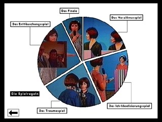Taking as point of departure the myth of Narcissus, and transferring the latter to the subject and its relationship to the medium, the Hamburg-based group of women artists -Innen this time used the TV medium to transport their theses relating to that very medium. Unlike in the previous multimedia performance (‘Narzismus in den Medien am Beispiel Fernsehen 1.1 Das Begehren', Hamburg, Munich, Zurich, 1993-94), the theories are presented not in abstract, didactic fashion, but in the form of TV programmes, namely as game shows. The ‘Narcissism Game', the ‘Ego Idealization Game', the ‘Trauma Game' and the ‘Disappointment Game' offer callers a range of multiple-choice prefabricated answers. Pre-produced computer animations, trailers and a specially composed noise/music track are fed into to the studio during the game shows.