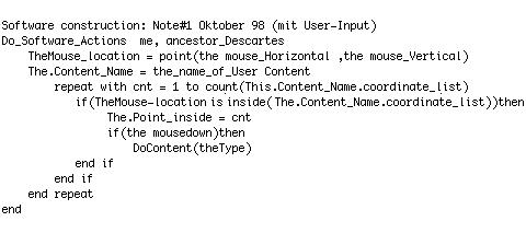 «Nine (9)» can most usefully be understood to work in these terms. It is a socio-technical pact between users of certain forms of license, language, cultures and environment. The various forms of its freeness or openness are being developed as part of the various rhythms of the life of this software; its production and critical engagement with the process of permission. «Nine (9)» requires and takes part in new social machines to spawn its codes, to diffuse and manage its development and implementation.