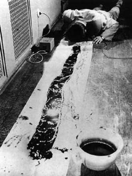 Karlheinz Stockhausen invited Paik to make a 7-minute appearance in the performances of his piece 'Originale' ('Originals'), which was first presented in Cologne on 26 October 1961. Paik varied his music action from performance to performance, but 'Simple' and 'Zen for Head' were basic elements which Paik later presented outside the scope of 'Originale', for instance in 1962 at the festival 'Fluxus Festspiele neuester Musik', Wiesbaden (photo). In 'Zen for Head', Paik dips his head in paint and draws a line on paper – in this way connecting his radical action with Asiatic calligraphy.